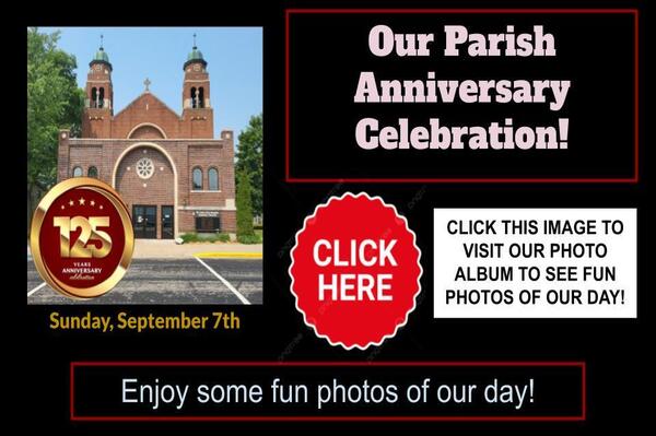 Join us for the 125th Parish Picnic on Sunday, September 7th. Mass at 10:30 am. A picnic luncheon, games, beer tent, basket raffle following the Mass. We hope you to see you there.